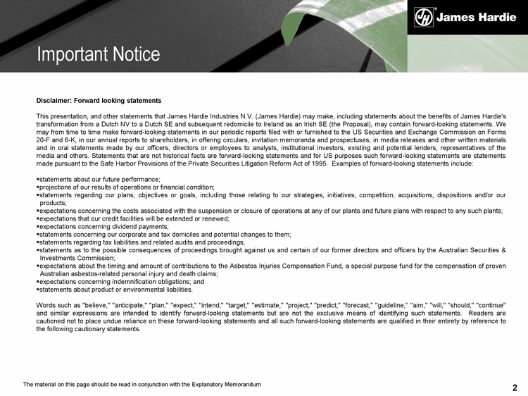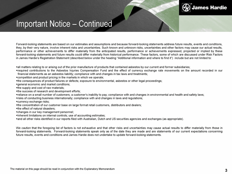2 Disclaimer: Forward looking statements This presentation, and other statements that James Hardie Industries N.V. (James Hardie) may make, including statements about the benefits of James Hardie's transformation from a Dutch NV to a Dutch SE and subsequent redomicile to Ireland as an Irish SE (the Proposal), may contain forward-looking statements. We may from time to time make forward-looking statements in our periodic reports filed with or furnished to the US Securities and Exchange Commission on Forms 20-F and 6-K, in our annual reports to shareholders, in offering circulars, invitation memoranda and prospectuses, in media releases and other written materials and in oral statements made by our officers, directors or employees to analysts, institutional investors, existing and potential lenders, representatives of the media and others. Statements that are not historical facts are forward-looking statements and for US purposes such forward-looking statements are statements made pursuant to the Safe Harbor Provisions of the Private Securities Litigation Reform Act of 1995. Examples of forward-looking statements include: statements about our future performance; projections of our results of operations or financial condition; statements regarding our plans, objectives or goals, including those relating to our strategies, initiatives, competition, acquisitions, dispositions and/or our products; expectations concerning the costs associated with the suspension or closure of operations at any of our plants and future plans with respect to any such plants; expectations that our credit facilities will be extended or renewed; expectations concerning dividend payments; statements concerning our corporate and tax domiciles and potential changes to them; statements regarding tax liabilities and related audits and proceedings; statements as to the possible consequences of proceedings brought against us and certain of our former directors and officers by the Australian Securities & Investments Commission; expectations about the timing and amount of contributions to the Asbestos Injuries Compensation Fund, a special purpose fund for the compensation of proven Australian asbestos-related personal injury and death claims; expectations concerning indemnification obligations; and statements about product or environmental liabilities. Words such as "believe," "anticipate," "plan," "expect," "intend," "target," "estimate," "project," "predict," "forecast," "guideline," "aim," "will," "should," "continue" and similar expressions are intended to identify forward-looking statements but are not the exclusive means of identifying such statements. Readers are cautioned not to place undue reliance on these forward-looking statements and all such forward-looking statements are qualified in their entirety by reference to the following cautionary statements. Important Notice