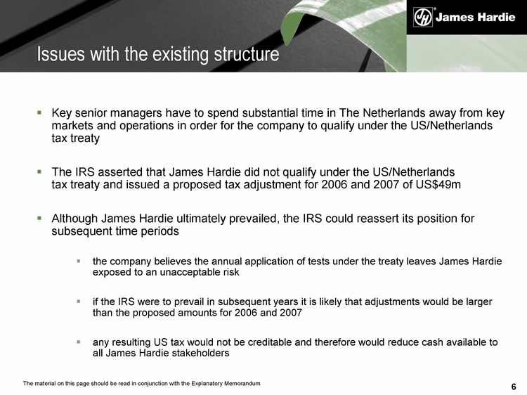 6 Key senior managers have to spend substantial time in The Netherlands away from key markets and operations in order for the company to qualify under the US/Netherlands tax treaty The IRS asserted that James Hardie did not qualify under the US/Netherlands tax treaty and issued a proposed tax adjustment for 2006 and 2007 of US$49m Although James Hardie ultimately prevailed, the IRS could reassert its position for subsequent time periods the company believes the annual application of tests under the treaty leaves James Hardie exposed to an unacceptable risk if the IRS were to prevail in subsequent years it is likely that adjustments would be larger than the proposed amounts for 2006 and 2007 any resulting US tax would not be creditable and therefore would reduce cash available to all James Hardie stakeholders Issues with the existing structure