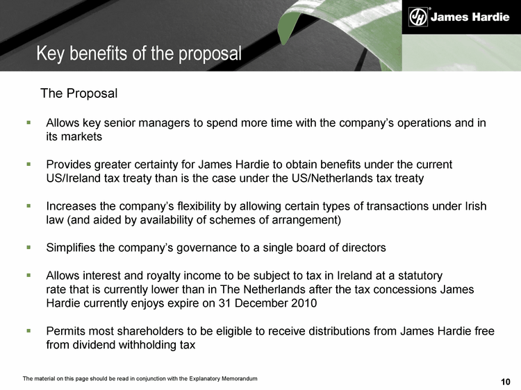10 Allows key senior managers to spend more time with the company's operations and in its markets Provides greater certainty for James Hardie to obtain benefits under the current US/Ireland tax treaty than is the case under the US/Netherlands tax treaty Increases the company's flexibility by allowing certain types of transactions under Irish law (and aided by availability of schemes of arrangement) Simplifies the company's governance to a single board of directors Allows interest and royalty income to be subject to tax in Ireland at a statutory rate that is currently lower than in The Netherlands after the tax concessions James Hardie currently enjoys expire on 31 December 2010 Permits most shareholders to be eligible to receive distributions from James Hardie free from dividend withholding tax Key benefits of the proposal The Proposal