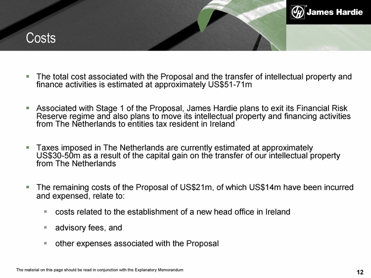 12 The total cost associated with the Proposal and the transfer of intellectual property and finance activities is estimated at approximately US$51-71m Associated with Stage 1 of the Proposal, James Hardie plans to exit its Financial Risk Reserve regime and also plans to move its intellectual property and financing activities from The Netherlands to entities tax resident in Ireland Taxes imposed in The Netherlands are currently estimated at approximately US$30-50m as a result of the capital gain on the transfer of our intellectual property from The Netherlands The remaining costs of the Proposal of US$21m, of which US$14m have been incurred and expensed, relate to: costs related to the establishment of a new head office in Ireland advisory fees, and other expenses associated with the Proposal Costs