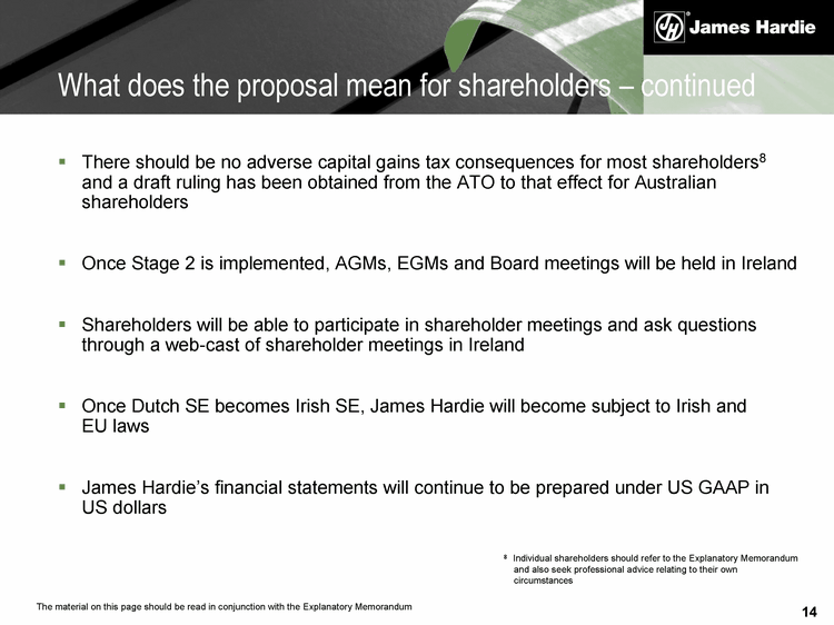 13 Shareholders will continue to hold the same securities James Hardie will continue to be listed on the ASX and NYSE Most shareholders7 will be able to receive distributions from Irish SE free from dividend withholding tax (currently subject to 15% Netherlands withholding tax - which may, depending on their circumstances, be available for offset or credit) To obtain exemption from dividend withholding tax shareholders will be required to file a non-Irish resident declaration form What does the proposal mean for shareholders 7 Shareholders resident in a jurisdiction that has not entered a tax treaty with Ireland and outside the EU will generally be subject to Irish dividend withholding tax at a rate of 20%