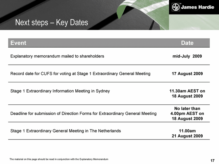16 Remaining in The Netherlands key senior managers would have to continue to spend considerable time in The Netherlands the favourable tax concessions James Hardie enjoys in The Netherlands expire on 31 December 2010 which would increase the statutory rate of tax to 25.5%9 the risk of the IRS taking an adverse view would continue Transferring our intellectual property to the US the cost of moving the intellectual property would still be incurred. such a move would not allow key senior managers to spend more time with our operations and in our markets the risk of the IRS taking an adverse view would continue in respect of dividend and interest payments from the US to The Netherlands Merely moving tax residence to Ireland we would still be subject to Dutch company law and its limitations Other options considered - continued 9 The Netherlands recently has proposed a compulsory group interest box regime. The exact terms of any such regime have not yet been determined.