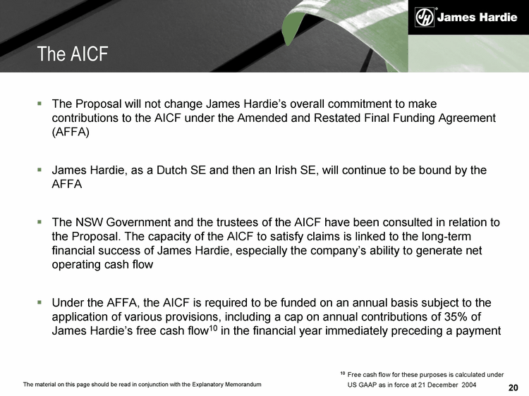 20 The Proposal will not change James Hardie's overall commitment to make contributions to the AICF under the Amended and Restated Final Funding Agreement (AFFA) James Hardie, as a Dutch SE and then an Irish SE, will continue to be bound by the AFFA The NSW Government and the trustees of the AICF have been consulted in relation to the Proposal. The capacity of the AICF to satisfy claims is linked to the long-term financial success of James Hardie, especially the company's ability to generate net operating cash flow Under the AFFA, the AICF is required to be funded on an annual basis subject to the application of various provisions, including a cap on annual contributions of 35% of James Hardie's free cash flow10 in the financial year immediately preceding a payment The AICF 10 Free cash flow for these purposes is calculated under US GAAP as in force at 21 December 2004