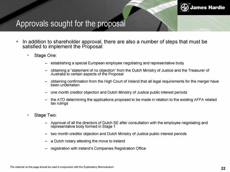 22 In addition to shareholder approval, there are also a number of steps that must be satisfied to implement the Proposal: Stage One: establishing a special European employee negotiating and representative body obtaining a "statement of no objection" from the Dutch Ministry of Justice and the Treasurer of Australia to certain aspects of the Proposal obtaining confirmation from the High Court of Ireland that all legal requirements for the merger have been undertaken one month creditor objection and Dutch Ministry of Justice public interest periods the ATO determining the applications proposed to be made in relation to the existing AFFA related tax rulings Stage Two: Approval of all the directors of Dutch SE after consultation with the employee negotiating and representative body formed in Stage 1 two month creditor objection and Dutch Ministry of Justice public interest periods a Dutch notary attesting the move to Ireland registration with Ireland's Companies Registration Office Approvals sought for the proposal