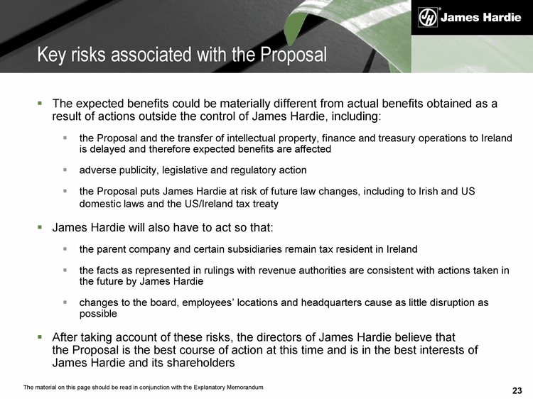 23 The expected benefits could be materially different from actual benefits obtained as a result of actions outside the control of James Hardie, including: the Proposal and the transfer of intellectual property, finance and treasury operations to Ireland is delayed and therefore expected benefits are affected adverse publicity, legislative and regulatory action the Proposal puts James Hardie at risk of future law changes, including to Irish and US domestic laws and the US/Ireland tax treaty James Hardie will also have to act so that: the parent company and certain subsidiaries remain tax resident in Ireland the facts as represented in rulings with revenue authorities are consistent with actions taken in the future by James Hardie changes to the board, employees' locations and headquarters cause as little disruption as possible After taking account of these risks, the directors of James Hardie believe that the Proposal is the best course of action at this time and is in the best interests of James Hardie and its shareholders Key risks associated with the Proposal