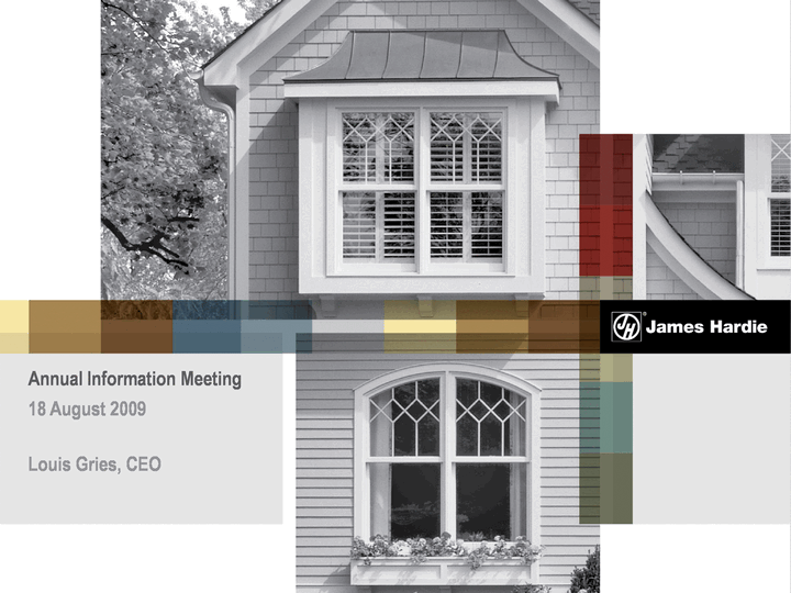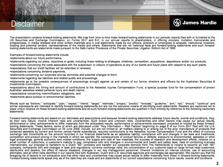 | 2 Disclaimer The presentation contains forward-looking statements. We may from time to time make forward-looking statements in our periodic reports filed with or furnished to the US Securities and Exchange Commission, on Forms 20-F and 6-K, in our annual reports to shareholders, in offering circulars, invitation memoranda and prospectuses, in media releases and other written materials and in oral statements made by our officers, directors or employees to analysts, institutional investors, existing and potential lenders, representatives of the media and others. Statements that are not historical facts are forward-looking statements and such forward- looking statements are statements made pursuant to the Safe Harbor Provisions of the Private Securities Litigation Reform Act of 1995. Examples of forward-looking statements include:statements about our future performance; statements regarding our plans, objectives or goals, including those relating to strategies, initiatives, competition, acquisitions, dispositions and/or our products; expectations concerning the costs associated with the suspension or closure of operations at any of our plants and future plans with respect to any such plants; expectations that our credit facilities will be extended or renewed; expectations concerning dividend payments;statements concerning our corporate and tax domiciles and potential changes to them;statements regarding tax liabilities and related audits and proceedings;statements as to the possible consequences of proceedings brought against us and certain of our former directors and officers by the Australian Securities & Investments Commission;expectations about the timing and amount of contributions to the Asbestos Injuries Compensation Fund, a special purpose fund for the compensation of proven Australian asbestos-related personal injury and death claims;expectations concerning indemnification obligations; and statements about product or environmental liabilities.Words such as "believe," "anticipate," "plan," "expect," "intend," "target," "estimate," "project," "predict," "forecast," "guideline," "aim," "will," "should," "continue" and similar expressions are intended to identify forward-looking statements but are not the exclusive means of identifying such statements. Readers are cautioned not to place undue reliance on these forward-looking statements and all such forward-looking statements are qualified in their entirety by reference to the following cautionary statements.Forward-looking statements are based on our estimates and assumptions and because forward-looking statements address future results, events and conditions, they, by their very nature, involve inherent risks and uncertainties. Such known and unknown risks, uncertainties and other factors may cause our actual results, performance or other achievements to differ materially from the anticipated results, performance or achievements expressed, projected or implied by these forward- looking statements. These factors, some of which are discussed under "Key Information - Risk Factors" beginning on page 6 of our Form 20-F filed with the U.S. Securities and Exchange Commission on 25 June 2009, include, but are not limited to: all matters relating to or arising out of the prior manufacture of products that contained asbestos by current and former James Hardie subsidiaries; required contributions to the Asbestos Injuries Compensation Fund and the effect of currency exchange rate movements on the amount recorded in our financial statements as an asbestos liability; compliance with and changes in tax laws and treatments; competition and product pricing in the markets in which we operate; the consequences of product failures or defects; exposure to environmental, asbestos or other legal proceedings; general economic and market conditions; the supply and cost of raw materials; the success of research and development efforts; reliance on a small number of customers; a customer's inability to pay; compliance with and changes in environmental and health and safety laws; risks of conducting business internationally; our proposal to transform to a Dutch "SE" company and transfer our corporate domicile from The Netherlands to Ireland to become an Irish "SE" company; compliance with and changes in laws and regulations; currency exchange risks; the concentration of our customer base on large format retail customers, distributors and dealers; the effect of natural disasters; changes in our key management personnel; inherent limitations on internal controls; use of accounting estimates; and all other risks identified in our reports filed with Australian, Dutch and U.S. securities agencies and exchanges (as appropriate). We caution you that the foregoing list of factors is not exhaustive and that other risks and uncertainties may cause actual results to differ materially from those in forward-looking statements. Forward-looking statements speak only as of the date they are made and are statements of our current expectations concerning future results, events and conditions. |