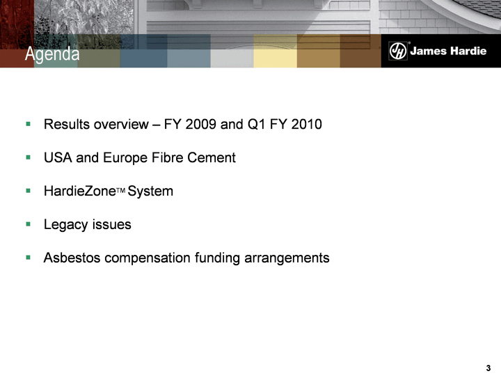| 3 Results overview - FY 2009 and Q1 FY 2010USA and Europe Fibre Cement HardieZoneTM SystemLegacy issues Asbestos compensation funding arrangements Agenda |