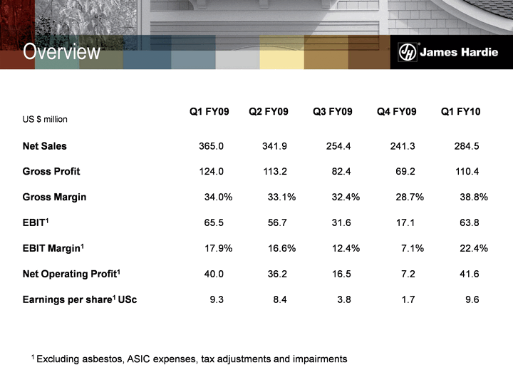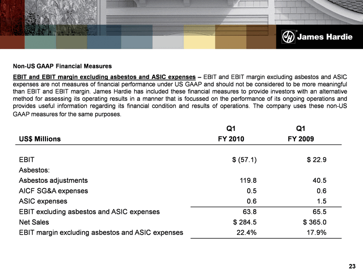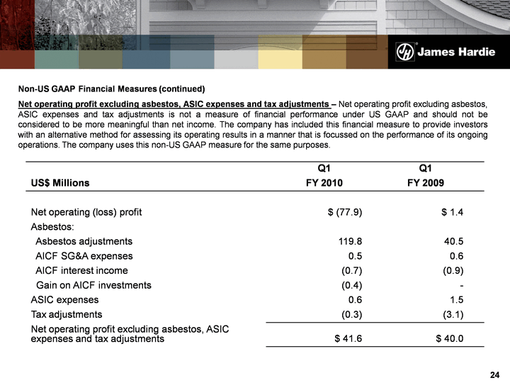 | 23 Non-US GAAP Financial MeasuresEBIT and EBIT margin excluding asbestos and ASIC expenses - EBIT and EBIT margin excluding asbestos and ASIC expenses are not measures of financial performance under US GAAP and should not be considered to be more meaningful than EBIT and EBIT margin. James Hardie has included these financial measures to provide investors with an alternative method for assessing its operating results in a manner that is focussed on the performance of its ongoing operations and provides useful information regarding its financial condition and results of operations. The company uses these non-US GAAP measures for the same purposes. Q1 Q1 US$ Millions FY 2010 FY 2009 EBIT $ (57.1) $ 22.9 Asbestos: Asbestos adjustments 119.8 40.5 AICF SG&A expenses 0.5 0.6 ASIC expenses 0.6 1.5 EBIT excluding asbestos and ASIC expenses 63.8 65.5 Net Sales $ 284.5 $ 365.0 EBIT margin excluding asbestos and ASIC expenses 22.4% 17.9% |