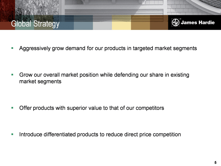 | 5 Aggressively grow demand for our products in targeted market segmentsGrow our overall market position while defending our share in existing market segmentsOffer products with superior value to that of our competitorsIntroduce differentiated products to reduce direct price competition Global Strategy |