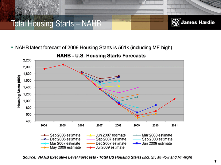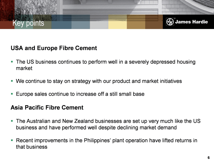 | 6 USA and Europe Fibre CementThe US business continues to perform well in a severely depressed housing market We continue to stay on strategy with our product and market initiatives Europe sales continue to increase off a still small baseAsia Pacific Fibre Cement The Australian and New Zealand businesses are set up very much like the US business and have performed well despite declining market demandRecent improvements in the Philippines' plant operation have lifted returns in that business Key points |