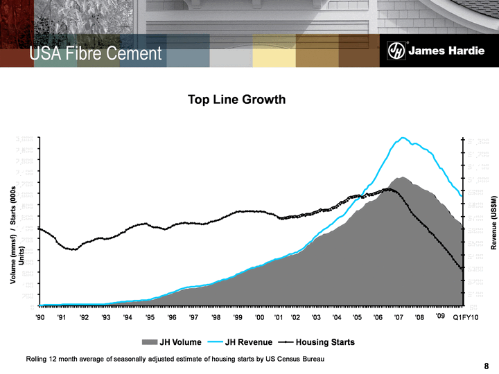| 8 USA Fibre Cement Rolling 12 month average of seasonally adjusted estimate of housing starts by US Census Bureau Top Line Growth 0 200 400 600 800 1,000 1,200 1,400 1,600 1,800 2,000 2,200 2,400 2,600 2,800 3,000 '90 '91 '92 '93 '94 '95 '96 '97 '98 '99 '00 '01 '02 '03 '04 '05 '06 '07 '08 Q1FY10 Volume (mmsf) / Starts (000s Units) $0 $100 $200 $300 $400 $500 $600 $700 $800 $900 $1,000 $1,100 $1,200 $1,300 Revenue (US$M) JH Volume JH Revenue Housing Starts '09 |
