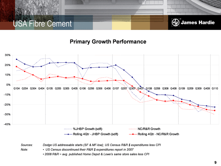 | 9 USA Fibre Cement Primary Growth Performance Sources: Dodge US addressable starts (SF & MF-low); US Census R&R $ expenditures less CPINote: US Census discontinued their R&R $ expenditures report in 2007 2008 R&R = avg. published Home Depot & Lowe's same store sales less CPI |