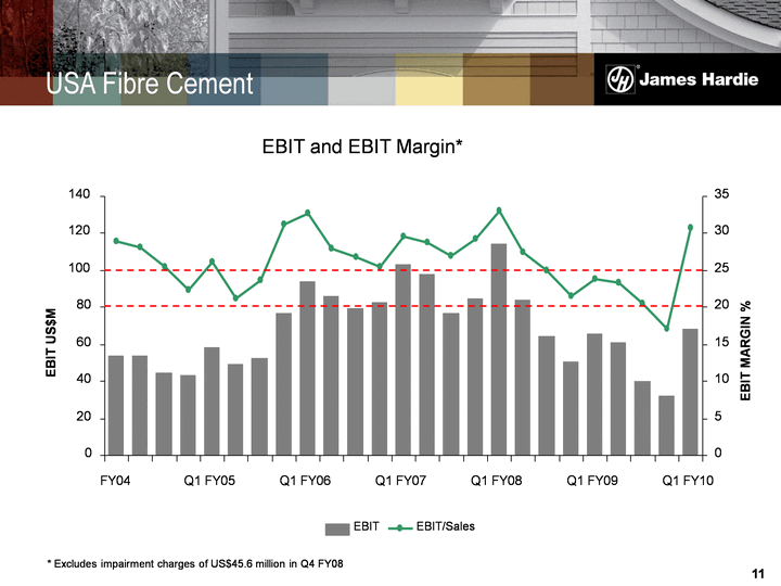| 10 Average Net Selling Price US$ per MSF USA Fibre Cement 380 420 460 500 540 580 620 FY04 FY05 FY06 FY07 FY08 FY09 Q1 FY10 US$625 |