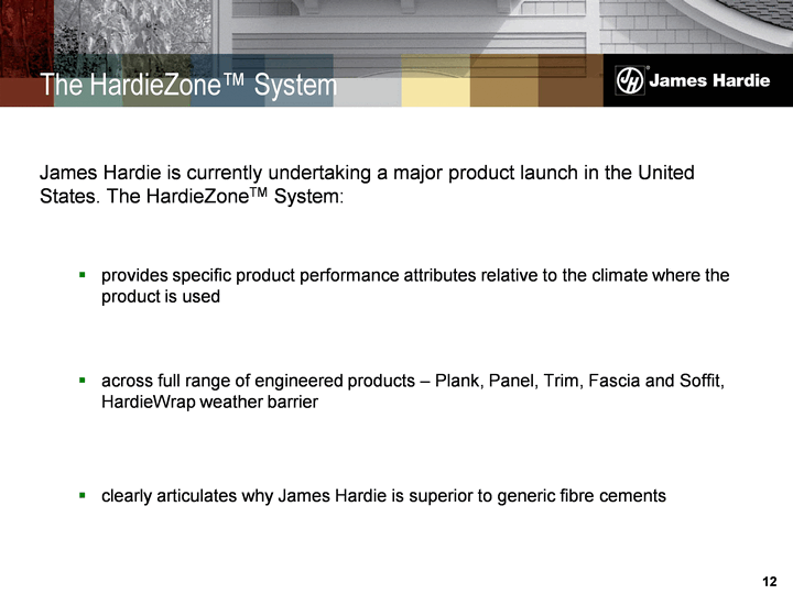 | 12 The HardieZone(tm) System James Hardie is currently undertaking a major product launch in the United States. The HardieZoneTM System:provides specific product performance attributes relative to the climate where the product is used across full range of engineered products - Plank, Panel, Trim, Fascia and Soffit, HardieWrap weather barrier clearly articulates why James Hardie is superior to generic fibre cements |
