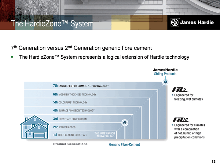 | 13 The HardieZone(tm) System 7th Generation versus 2nd Generation generic fibre cementThe HardieZone(tm) System represents a logical extension of Hardie technology |