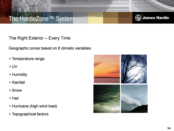 | 14 The HardieZone(tm) System The Right Exterior - Every TimeGeographic zones based on 8 climatic variables: Temperature range UV Humidity Rainfall Snow Hail Hurricane (high wind load) Topographical factors |