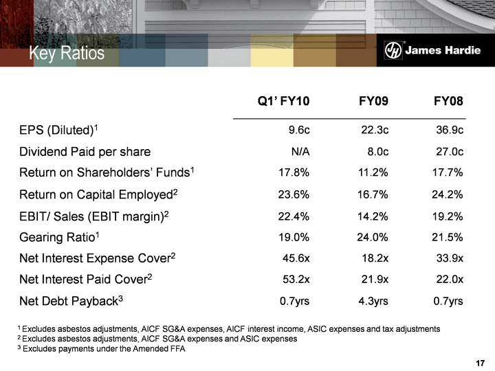 | 17 Key Ratios Q1' FY10 FY09 FY08 EPS (Diluted)1 9.6c 22.3c 36.9c Dividend Paid per share N/A 8.0c 27.0c Return on Shareholders' Funds1 17.8% 11.2% 17.7% Return on Capital Employed2 23.6% 16.7% 24.2% EBIT/ Sales (EBIT margin)2 22.4% 14.2% 19.2% Gearing Ratio1 19.0% 24.0% 21.5% Net Interest Expense Cover2 45.6x 18.2x 33.9x Net Interest Paid Cover2 53.2x 21.9x 22.0x Net Debt Payback3 0.7yrs 4.3yrs 0.7yrs 1 Excludes asbestos adjustments, AICF SG&A expenses, AICF interest income, ASIC expenses and tax adjustments2 Excludes asbestos adjustments, AICF SG&A expenses and ASIC expenses3 Excludes payments under the Amended FFA |