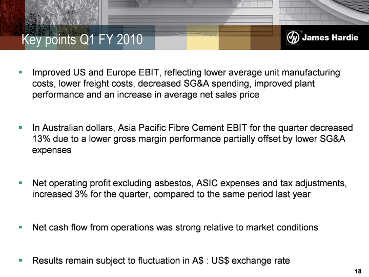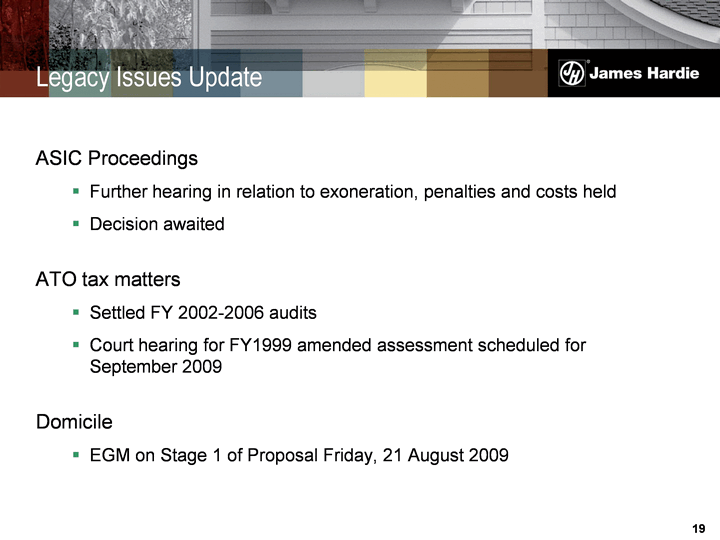 | 18 Improved US and Europe EBIT, reflecting lower average unit manufacturing costs, lower freight costs, decreased SG&A spending, improved plant performance and an increase in average net sales priceIn Australian dollars, Asia Pacific Fibre Cement EBIT for the quarter decreased 13% due to a lower gross margin performance partially offset by lower SG&A expenses Net operating profit excluding asbestos, ASIC expenses and tax adjustments, increased 3% for the quarter, compared to the same period last yearNet cash flow from operations was strong relative to market conditions Results remain subject to fluctuation in A$ : US$ exchange rate Key points Q1 FY 2010 |