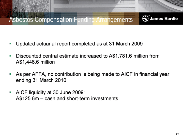 | 20 Updated actuarial report completed as at 31 March 2009Discounted central estimate increased to A$1,781.6 million from A$1,446.6 millionAs per AFFA, no contribution is being made to AICF in financial year ending 31 March 2010AICF liquidity at 30 June 2009: A$125.6m - cash and short-term investments Asbestos Compensation Funding Arrangements |