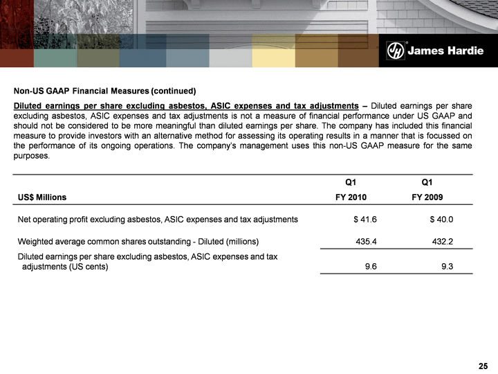 | 25 Non-US GAAP Financial Measures (continued)Diluted earnings per share excluding asbestos, ASIC expenses and tax adjustments - Diluted earnings per share excluding asbestos, ASIC expenses and tax adjustments is not a measure of financial performance under US GAAP and should not be considered to be more meaningful than diluted earnings per share. The company has included this financial measure to provide investors with an alternative method for assessing its operating results in a manner that is focussed on the performance of its ongoing operations. The company's management uses this non-US GAAP measure for the same purposes. Q1 Q1 US$ Millions FY 2010 FY 2009 Net operating profit excluding asbestos, ASIC expenses and tax adjustments $ 41.6 $ 40.0 Weighted average common shares outstanding - Diluted (millions) 435.4 432.2 Diluted earnings per share excluding asbestos, ASIC expenses and tax adjustments (US cents) 9.6 9.3 |