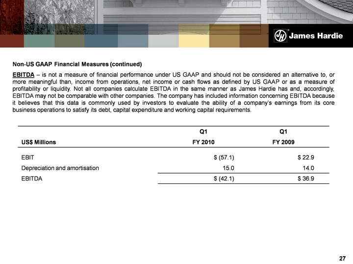 | 27 Non-US GAAP Financial Measures (continued)EBITDA - is not a measure of financial performance under US GAAP and should not be considered an alternative to, or more meaningful than, income from operations, net income or cash flows as defined by US GAAP or as a measure of profitability or liquidity. Not all companies calculate EBITDA in the same manner as James Hardie has and, accordingly, EBITDA may not be comparable with other companies. The company has included information concerning EBITDA because it believes that this data is commonly used by investors to evaluate the ability of a company's earnings from its core business operations to satisfy its debt, capital expenditure and working capital requirements. Q1 Q1 US$ Millions FY 2010 FY 2009 EBIT $ (57.1) $ 22.9 Depreciation and amortisation 15.0 14.0 EBITDA $ (42.1) $ 36.9 |