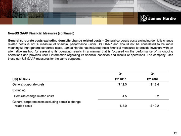 | 28 Non-US GAAP Financial Measures (continued)General corporate costs excluding domicile change related costs - General corporate costs excluding domicile change related costs is not a measure of financial performance under US GAAP and should not be considered to be more meaningful than general corporate costs. James Hardie has included these financial measures to provide investors with an alternative method for assessing its operating results in a manner that is focussed on the performance of its ongoing operations and provides useful information regarding its financial condition and results of operations. The company uses these non-US GAAP measures for the same purposes. Q1 Q1 Q1 Q1 US$ Millions FY 2010 FY 2010 FY 2009 FY 2009 General corporate costs $ 12.5 $ 12.4 Excluding: Domicile change related costs 4.5 0.2 General corporate costs excluding domicile change related costs $ 8.0 $ 12.2 |