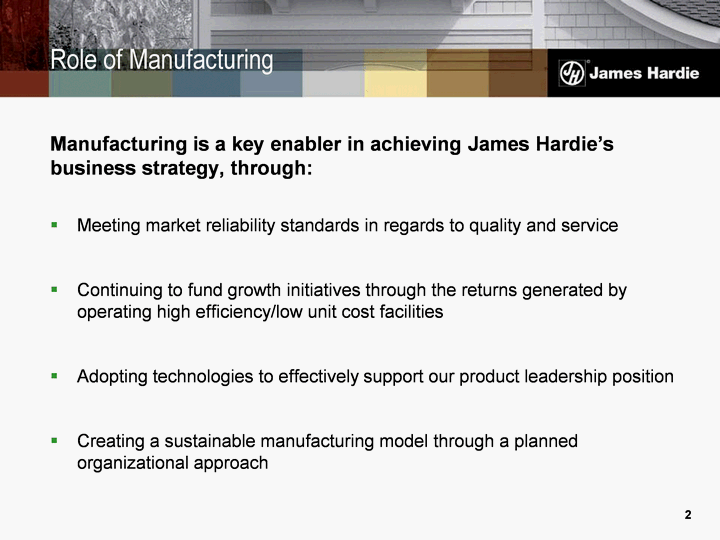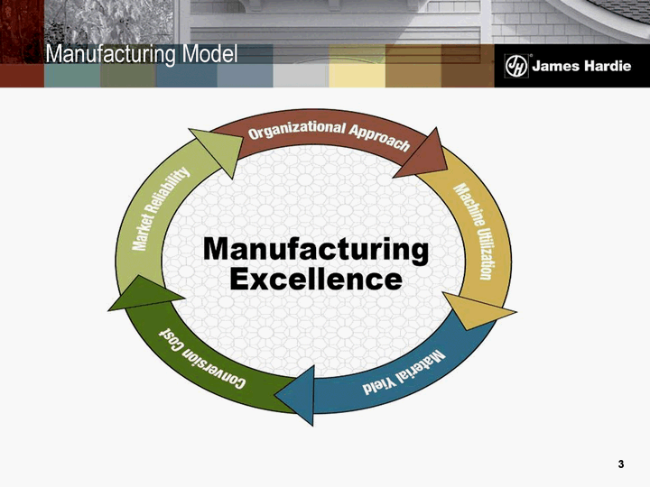 | 2 Manufacturing is a key enabler in achieving James Hardie's business strategy, through: Meeting market reliability standards in regards to quality and service Continuing to fund growth initiatives through the returns generated by operating high efficiency/low unit cost facilities Adopting technologies to effectively support our product leadership position Creating a sustainable manufacturing model through a planned organizational approach Role of Manufacturing |