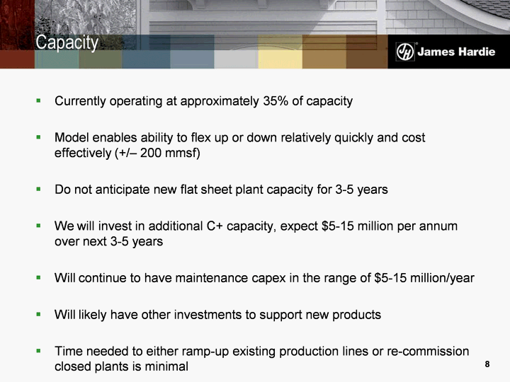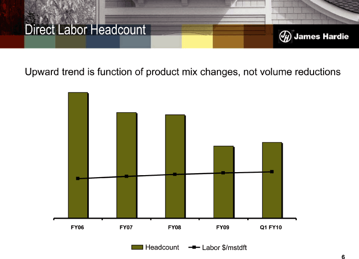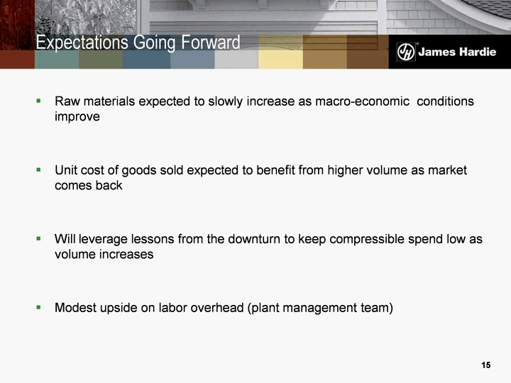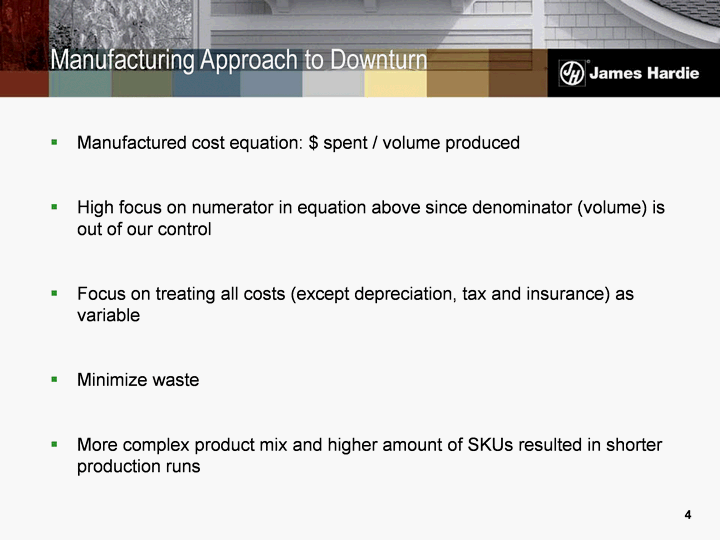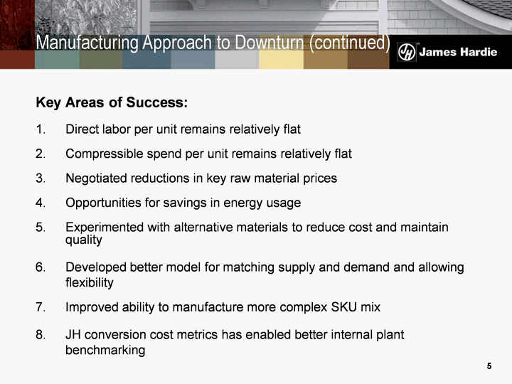 | 5 Key Areas of Success: Direct labor per unit remains relatively flat Compressible spend per unit remains relatively flat Negotiated reductions in key raw material prices Opportunities for savings in energy usage Experimented with alternative materials to reduce cost and maintain quality Developed better model for matching supply and demand and allowing flexibility Improved ability to manufacture more complex SKU mix JH conversion cost metrics has enabled better internal plant benchmarking Manufacturing Approach to Downturn (continued) |