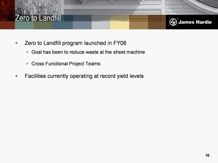 | 10 Zero to Landfill program launched in FY08 Goal has been to reduce waste at the sheet machine Cross Functional Project Teams Facilities currently operating at record yield levels Zero to Landfill |