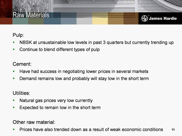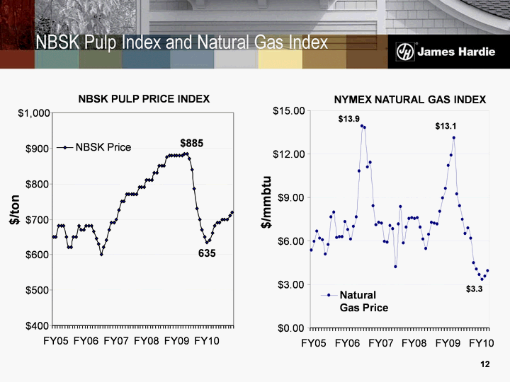 | 11 Pulp: NBSK at unsustainable low levels in past 3 quarters but currently trending up Continue to blend different types of pulp Cement: Have had success in negotiating lower prices in several markets Demand remains low and probably will stay low in the short term Utilities: Natural gas prices very low currently Expected to remain low in the short term Other raw material: Prices have also trended down as a result of weak economic conditions Raw Materials |