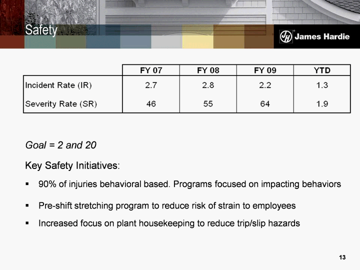| 13 Goal = 2 and 20 Key Safety Initiatives: 90% of injuries behavioral based. Programs focused on impacting behaviors Pre-shift stretching program to reduce risk of strain to employees Increased focus on plant housekeeping to reduce trip/slip hazards Safety |
