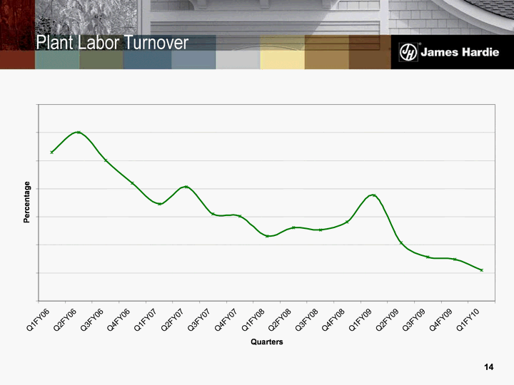 | 14 Plant Labor Turnover Q3FY07 Q4FY07 Q1FY08 Q2FY08 Q3FY08 Q4FY08 Q1FY09 Q2FY09 Q3FY09 Q4FY09 Q1FY10 Quarters Percentage |