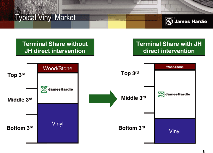 | 8 Middle 3rd Top 3rd Terminal Share without JH direct intervention Bottom 3rd Terminal Share with JH direct intervention Middle 3rd Top 3rd Bottom 3rd Wood/Stone Wood/Stone Vinyl Vinyl Typical Vinyl Market |