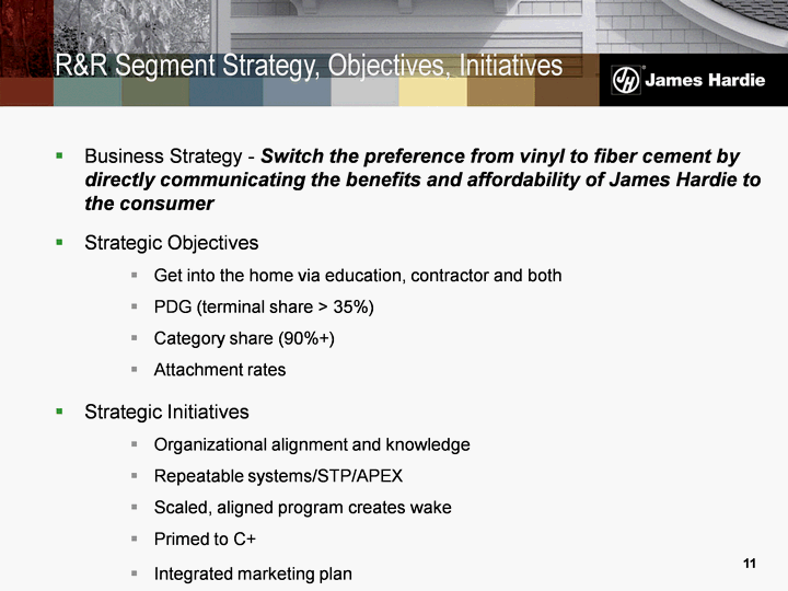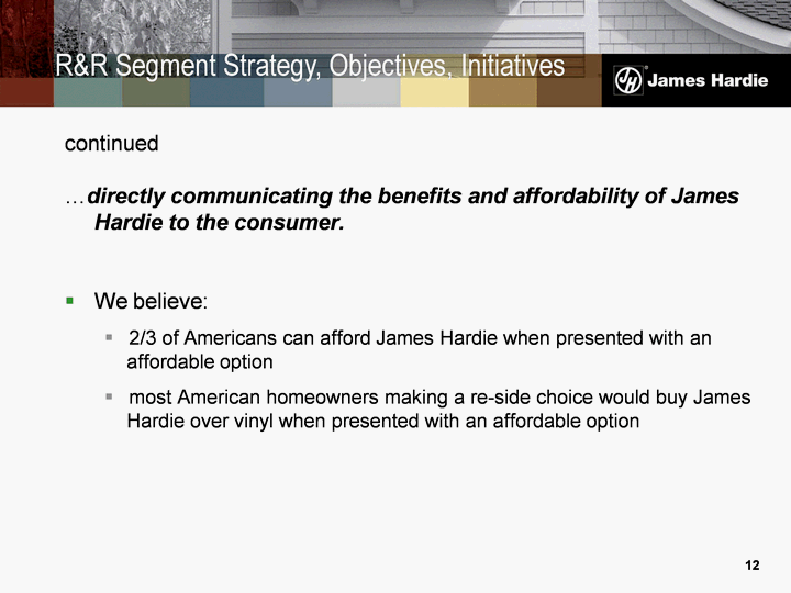 | 11 Business Strategy - Switch the preference from vinyl to fiber cement by directly communicating the benefits and affordability of James Hardie to the consumer Strategic Objectives Get into the home via education, contractor and both PDG (terminal share > 35%) Category share (90%+) Attachment rates Strategic Initiatives Organizational alignment and knowledge Repeatable systems/STP/APEX Scaled, aligned program creates wake Primed to C+ Integrated marketing plan R&R Segment Strategy, Objectives, Initiatives |