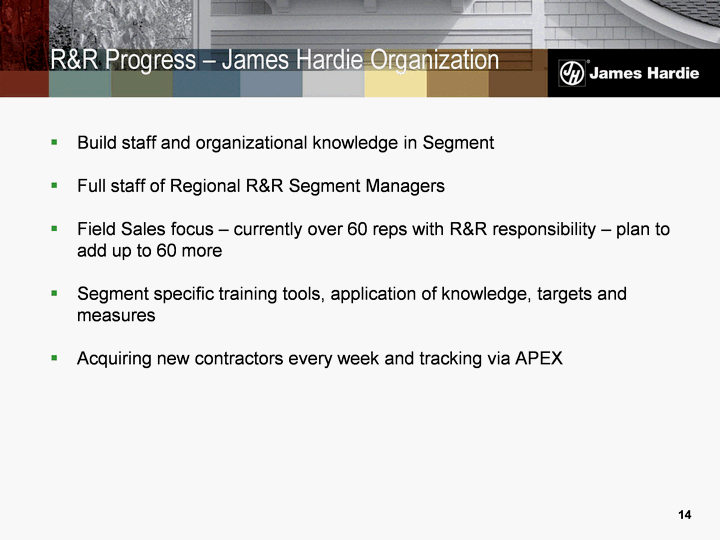 | 14 Build staff and organizational knowledge in Segment Full staff of Regional R&R Segment Managers Field Sales focus - currently over 60 reps with R&R responsibility - plan to add up to 60 more Segment specific training tools, application of knowledge, targets and measures Acquiring new contractors every week and tracking via APEX R&R Progress - James Hardie Organization |