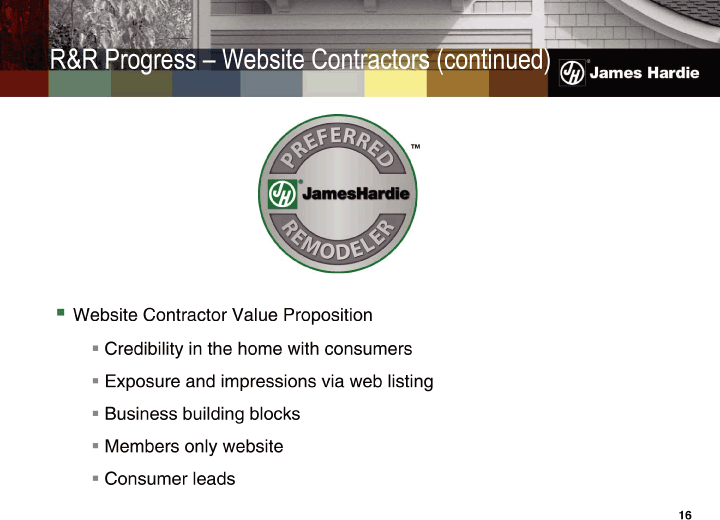 | 15 Re-launched program in December 2008 Set program requirements around goals and measures aligned with James Hardie strategies Contractor "attachment rates" for C+, Trim and Wrap and Job Tracker Reporting R&R Progress - Website Contractors |