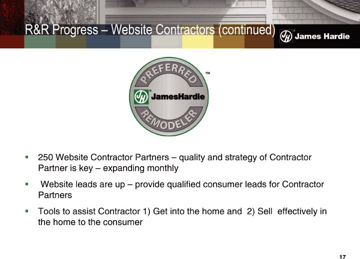 | 16 16 Website Contractor Value Proposition Credibility in the home with consumers Exposure and impressions via web listing Business building blocks Members only website Consumer leads R&R Progress - Website Contractors (continued) |