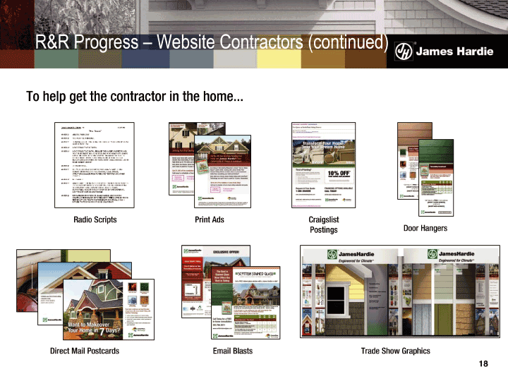 | 18 To help get the contractor in the home... Radio Scripts Print Ads Craigslist Postings Direct Mail Postcards Door Hangers Email Blasts Trade Show Graphics R&R Progress - Website Contractors (continued) |