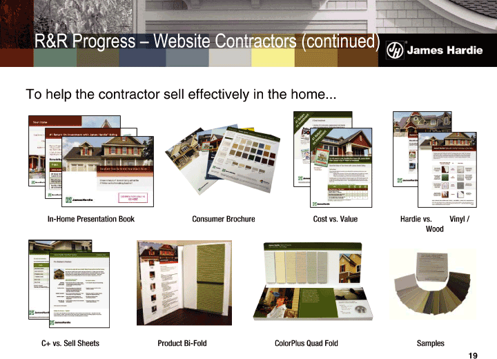 | 19 To help the contractor sell effectively in the home... In-Home Presentation Book Consumer Brochure Hardie vs. Vinyl / Wood Cost vs. Value Product Bi-Fold ColorPlus Quad Fold Samples C+ vs. Sell Sheets R&R Progress - Website Contractors (continued) |