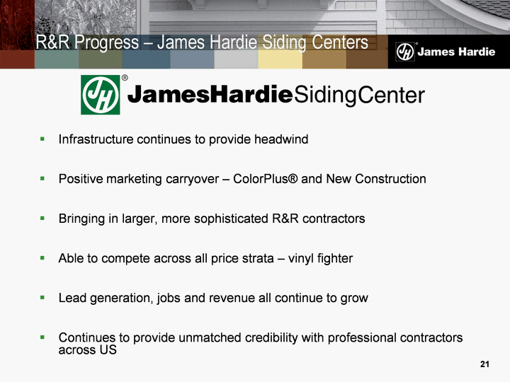 | 21 Infrastructure continues to provide headwind Positive marketing carryover - ColorPlus(r) and New Construction Bringing in larger, more sophisticated R&R contractors Able to compete across all price strata - vinyl fighter Lead generation, jobs and revenue all continue to grow Continues to provide unmatched credibility with professional contractors across US R&R Progress - James Hardie Siding Centers |
