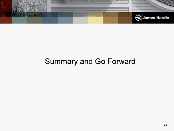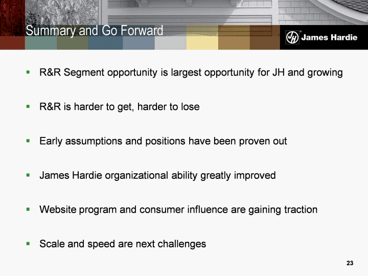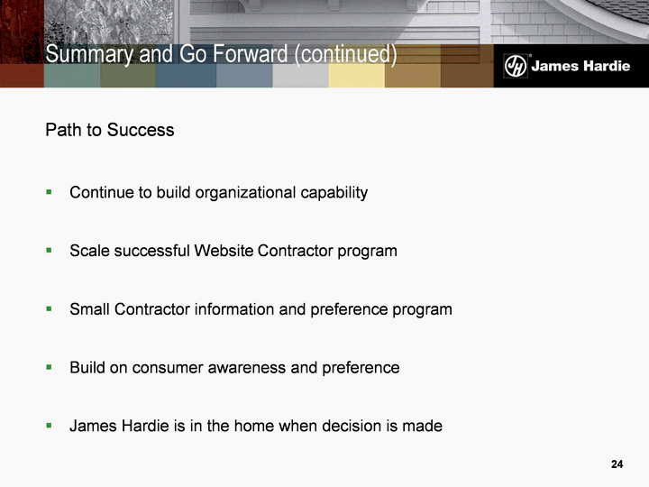 | 23 R&R Segment opportunity is largest opportunity for JH and growing R&R is harder to get, harder to lose Early assumptions and positions have been proven out James Hardie organizational ability greatly improved Website program and consumer influence are gaining traction Scale and speed are next challenges Summary and Go Forward |