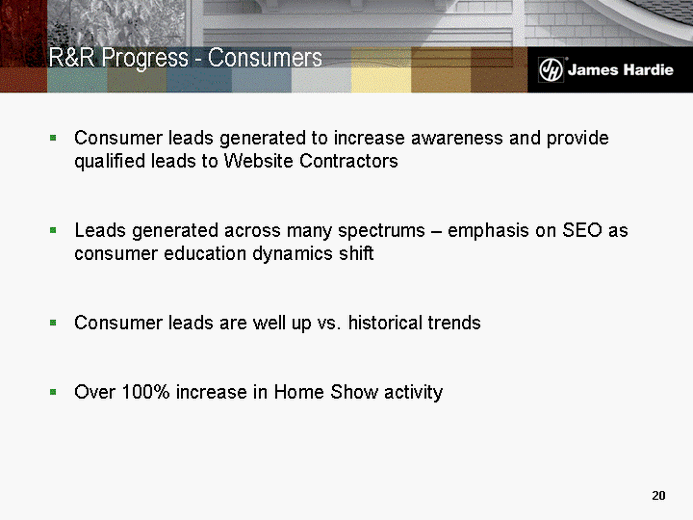 | 13 James Hardie Organization Website Contractors Program Consumer Awareness James Hardie Siding Center R&R Progress Update |