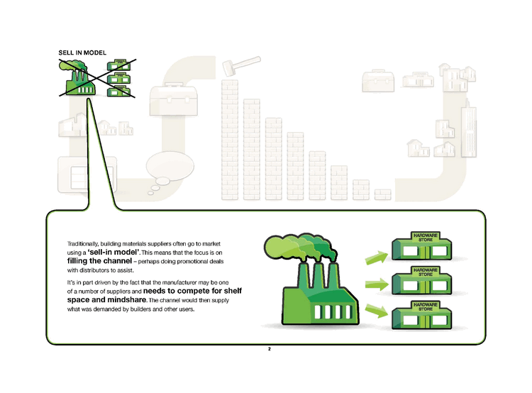 | SELL IN MODEL Traditionally, building materials suppliers often go to market using a 'sell-in model'. This means that the focus is on filling the Channel - perhaps doing promotional deals with distributors to assist. It's in part driven by the fact that the manufacturer may be one of a number of suppliers and needs to compete for shelf Space and mindshare.The channel would then supply what was demanded by builders and other users. |