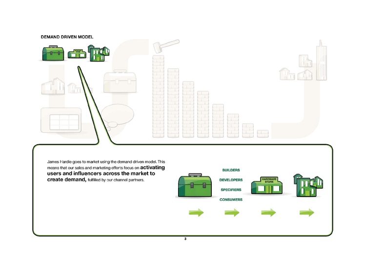 | DEMAND DRIVEN MODEL CHANNEL STRATEGY TRENDS SMARTERTOOLS BRICK PERCEPTIONS GENERATING DEMAND James Hardie adds value to customers, users and influencers, and breaks down the brick wall to generate demand through: Accelerate a soon-to-be-launched suite of best-in-class specification and installation guidance tools. |