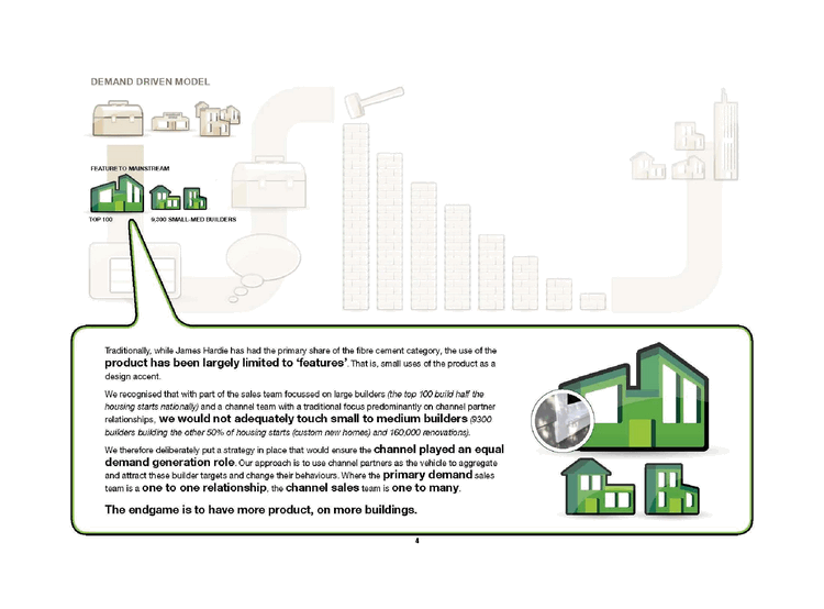 | DEMAND DRIVEN MODEL FEATURE TO MAINSTREAM TOP 100 9,300 SMALL-MED BUILDERS Traditionally, while James Hardie has had the primary share of the fibre cement category, the use of the product has been largely limited to 'features'. That is, small uses of the product as a design accent. We recognised that with part of the sales team focussed on large builders (the top 100 build half the housing starts nationally) and a channel team with a traditional focus predominantly on channel partner relationships, we would not adequately touch small to medium builders (9300 builders building the other 50% of housing starts (custom new homes) and 160,000 renovations). We therefore deliberately put a strategy in place that would ensure the channel played an equal demand generation role. Our approach is to use channel partners as the vehicle to aggregate and attract these builder targets and change their behaviours. Where the primary demand sales team is a one to one relationship, the channel sales team is one to many. The endgame is to have more product, on more buildings. |