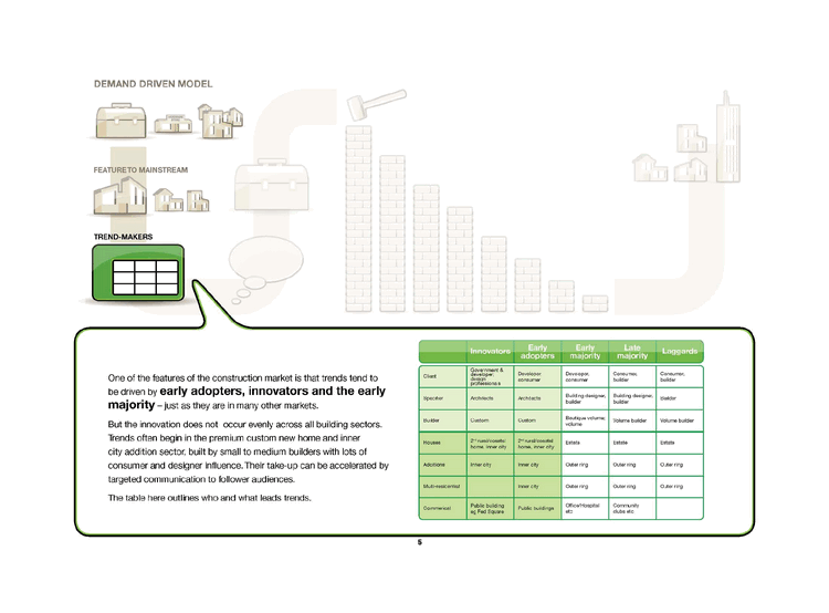 | DEMAND DRIVEN MODEL FEATURE TO MAINSTREAM TREND-MAKERS One of the features of the construction market is that trends tend to be driven by early adopters, innovators and the early majority - just as they are in many other markets. But the innovation does not occur evenly across all building sectors. Trends often begin in the premium custom new home and inner city addition sector, built by small to medium builders with lots of consumer and designer influence. Their take-up can be accelerated by targeted communication to follower audiences. The table here outlines who and what leads trends. Innovators Early Early Late Laggards adopters majority majority Client Government & Developer, consumer Developer, consumer Consumer. builder Consumer, builder developer: design Professionals Specifier Architects Architects Building designer, builder Building designer, builder Builder Builder Custom Custom Boutique volume; volume Volume builder Volume builder Houses 2"d rural/coastal 2nd rural/coastal Estate Estate Estate home, inner city home, inner city Additions Inner city Inner city Outer ring Outer ring Outer ring Multi-residential Inner city Outer ring Outer ring Outer ring Commerical Public building eg Fed Squars Public buildings Office/Hospital Community clubs etc etc |