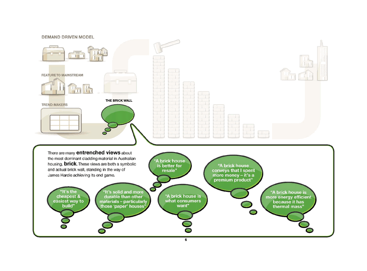 | DEMAND DRIVEN MODEL FEATURE TO MAINSTREAM TREND-MAKERS THE BRICK WALL There are many entrenched views about the most dominant cladding material in Australian housing, brick. These views are both a symbolic and actual brick wall, standing in the way of James Hardie achieving its end game. "A brick house is better for resale" "A brick house conveys that I spent more money - it's a premium product" It's the cheapest & easiest way to build" "It's solid and more durable than other materials - particularly those 'paper' houses" "A brick house is what consumers want" A brick house is more energy efficient because it has thermal mass" |