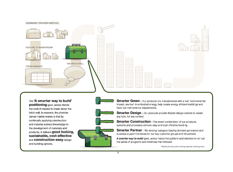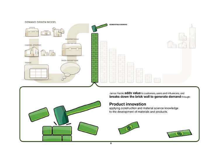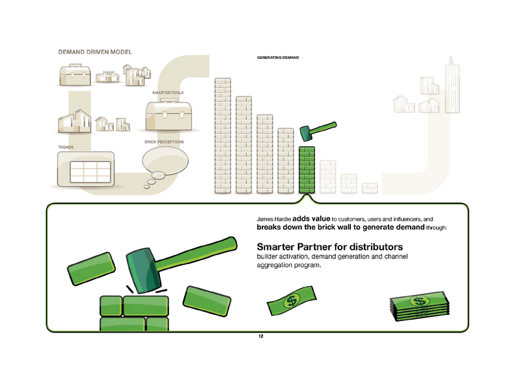 | DEMAND DRIVEN MODEL CHANNEL STRATEGY SMARTERTOOLS BRICK PERCEPTIONS GENERATING DEMAND TRENDS James Hardie adds value to customers, users and influencers, and breaks down the brick wall to generate demand-through: Product innovation applying construction and material science knowledge to the development of materials and products. |