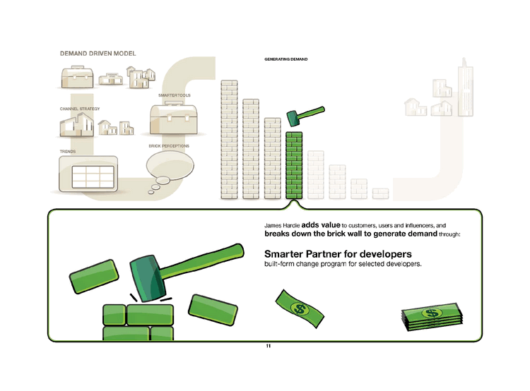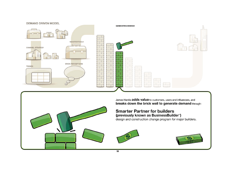 | DEMAND DRIVEN MODEL CHANNEL STRATEGY SMARTERTOOLS BRICK PERCEPTIONS GENERATING DEMAND TRENDS James Hardie adds value to customers, users and influencers, and breaks down the brick wall to generate demand through: Smarter Partner for builders (previously known as BusinessBuilder TM) design and construction change program for major builders. |