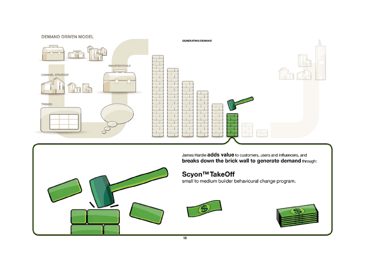 | DEMAND DRIVEN MODEL CHANNEL STRATEGY SMARTER TOOLS TRENDS GENERATING DEMAND James Hardie adds value to customers, users and influencers, and breaks down the brick wall to generate demand through: ScyoTM TakeOff small to medium builder behavioural change program. |